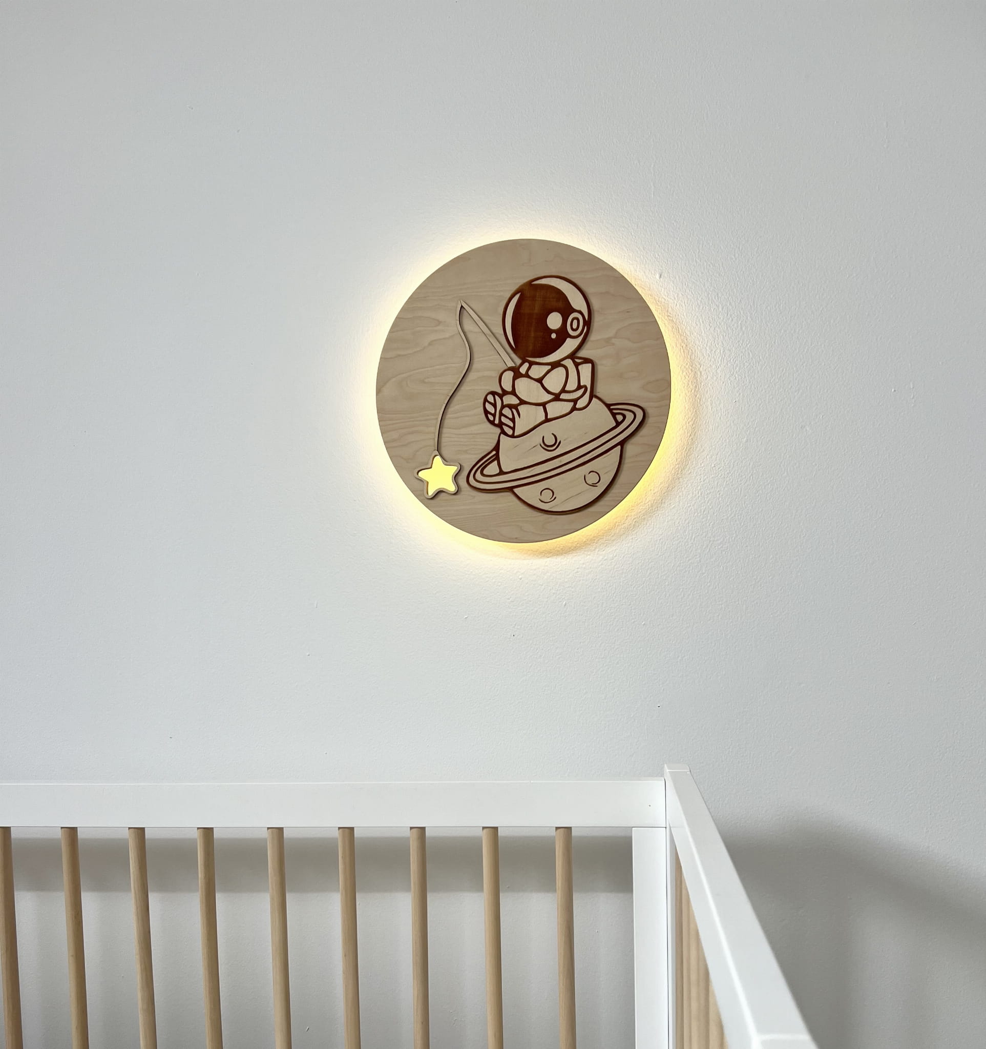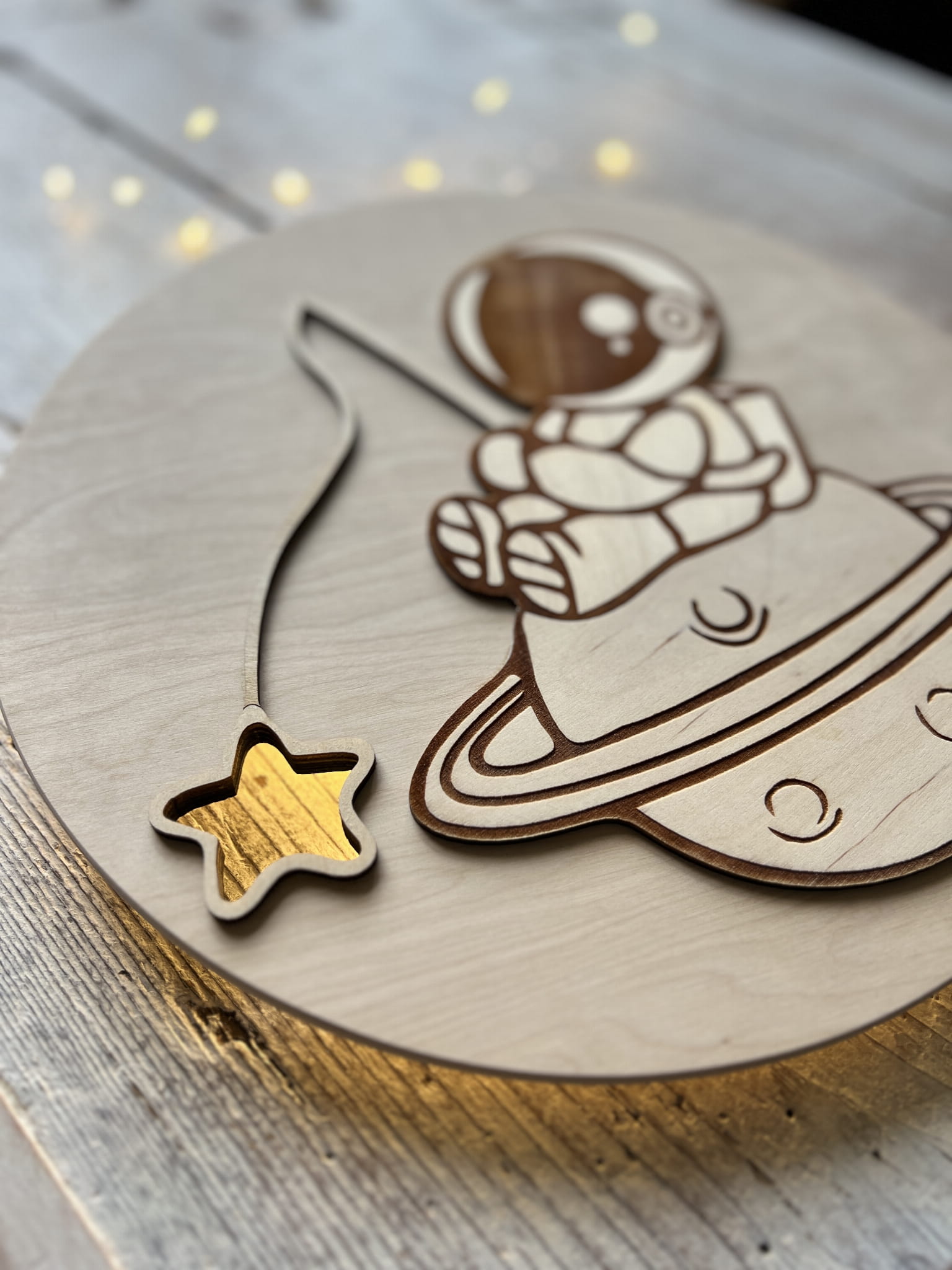 Drewniana lampka nocna „Astronauta łowiący gwiazdkę” – magiczna dekoracja do pokoju dziecka