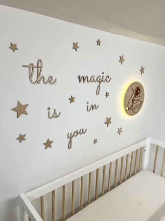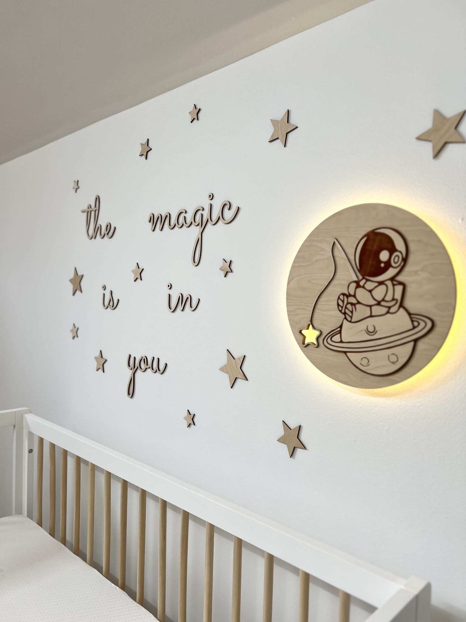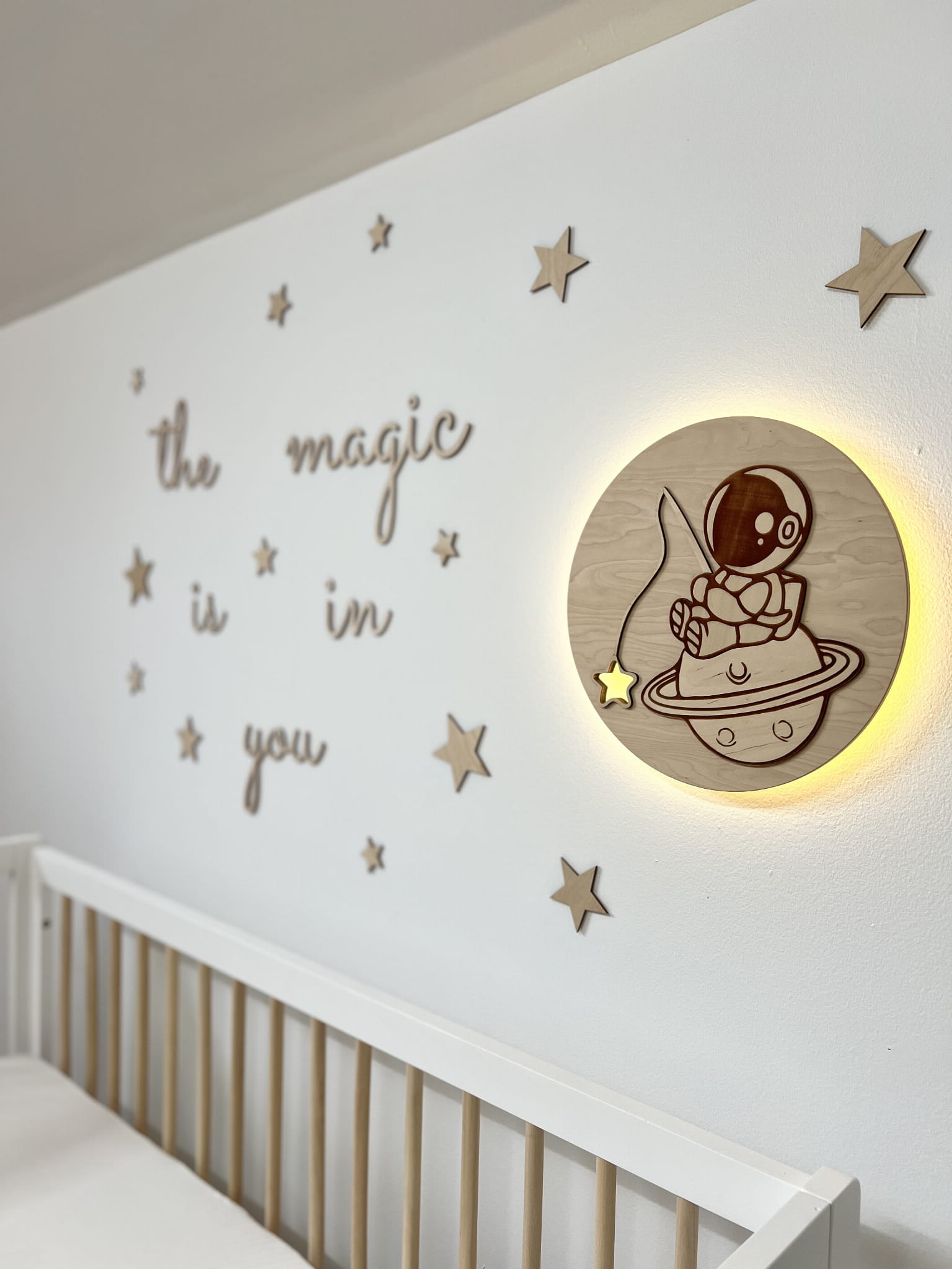 Podaruj swojemu dziecku niezwykły element dekoracyjny, który rozświetli jego pokój i pobudzi wyobraźnię! Drewniana lampka nocna „Astronauta łowiący gwiazdkę” to unikalna dekoracja ścienna przedstawiająca uroczego kosmonautę siedzącego na Księżycu i łowiącego świetlistą gwiazdkę. Dzięki precyzyjnemu wycięciu gwiazdy na wylot światło pięknie przez nią przechodzi, tworząc wyjątkowy efekt wizualny.
