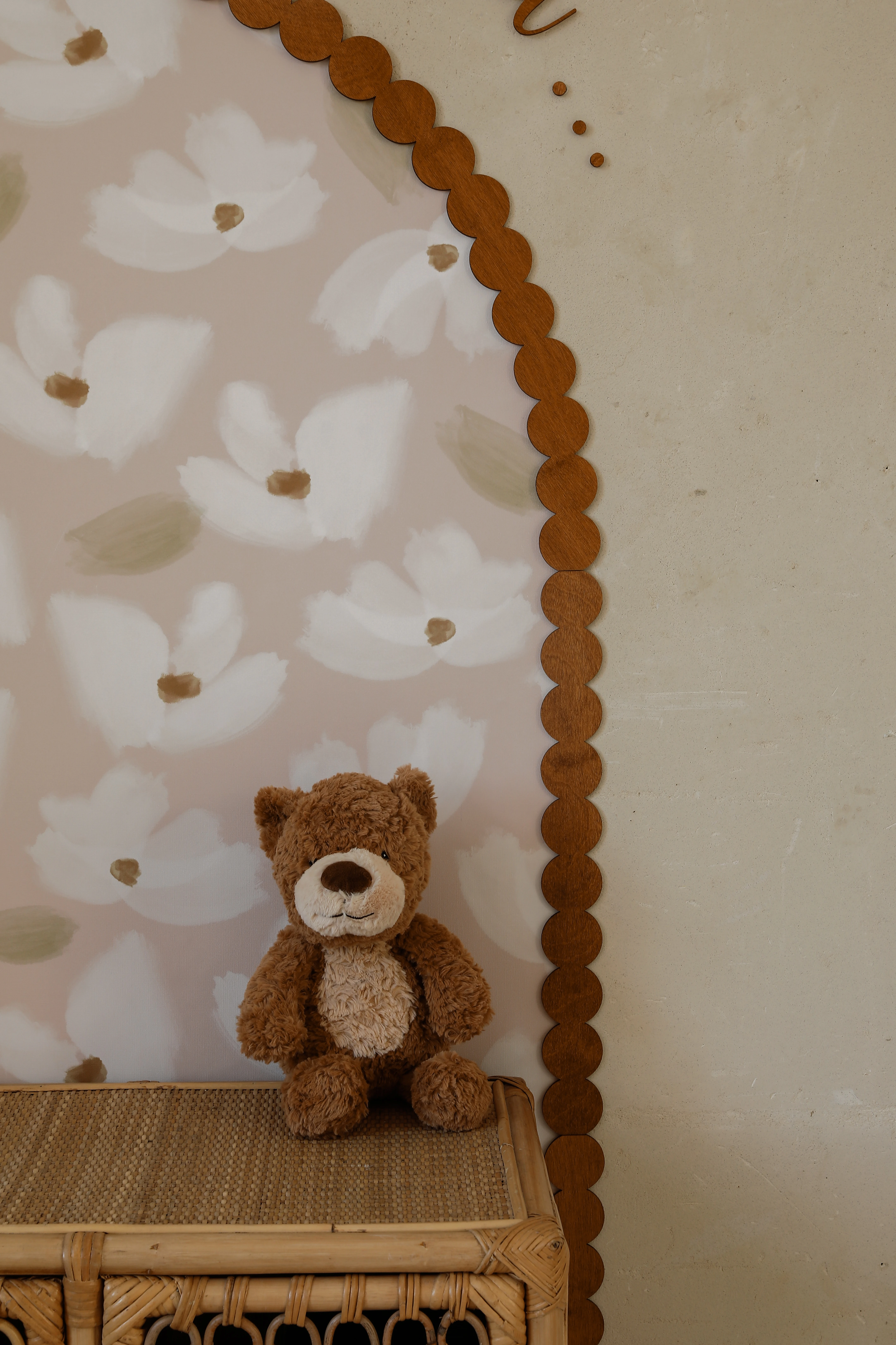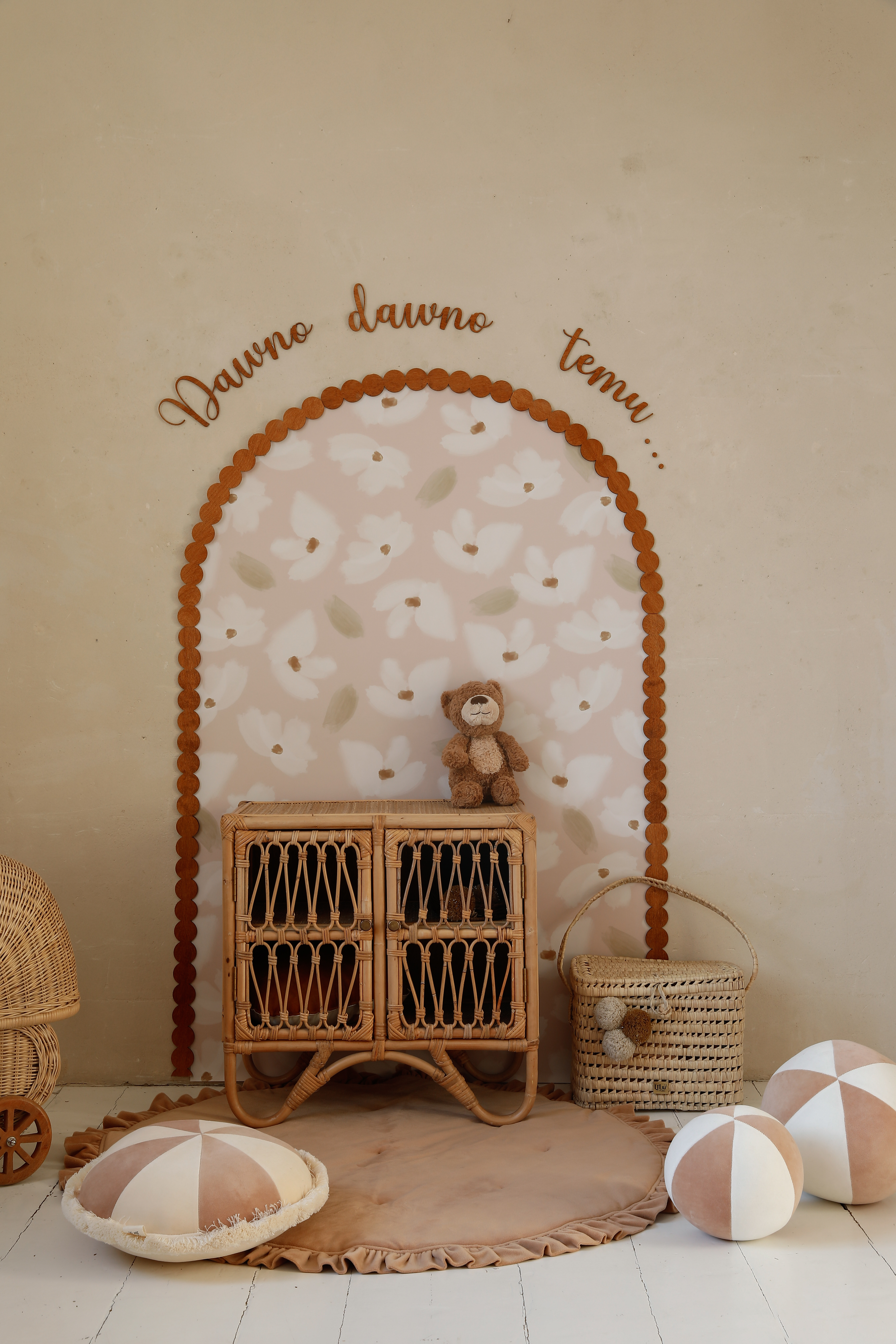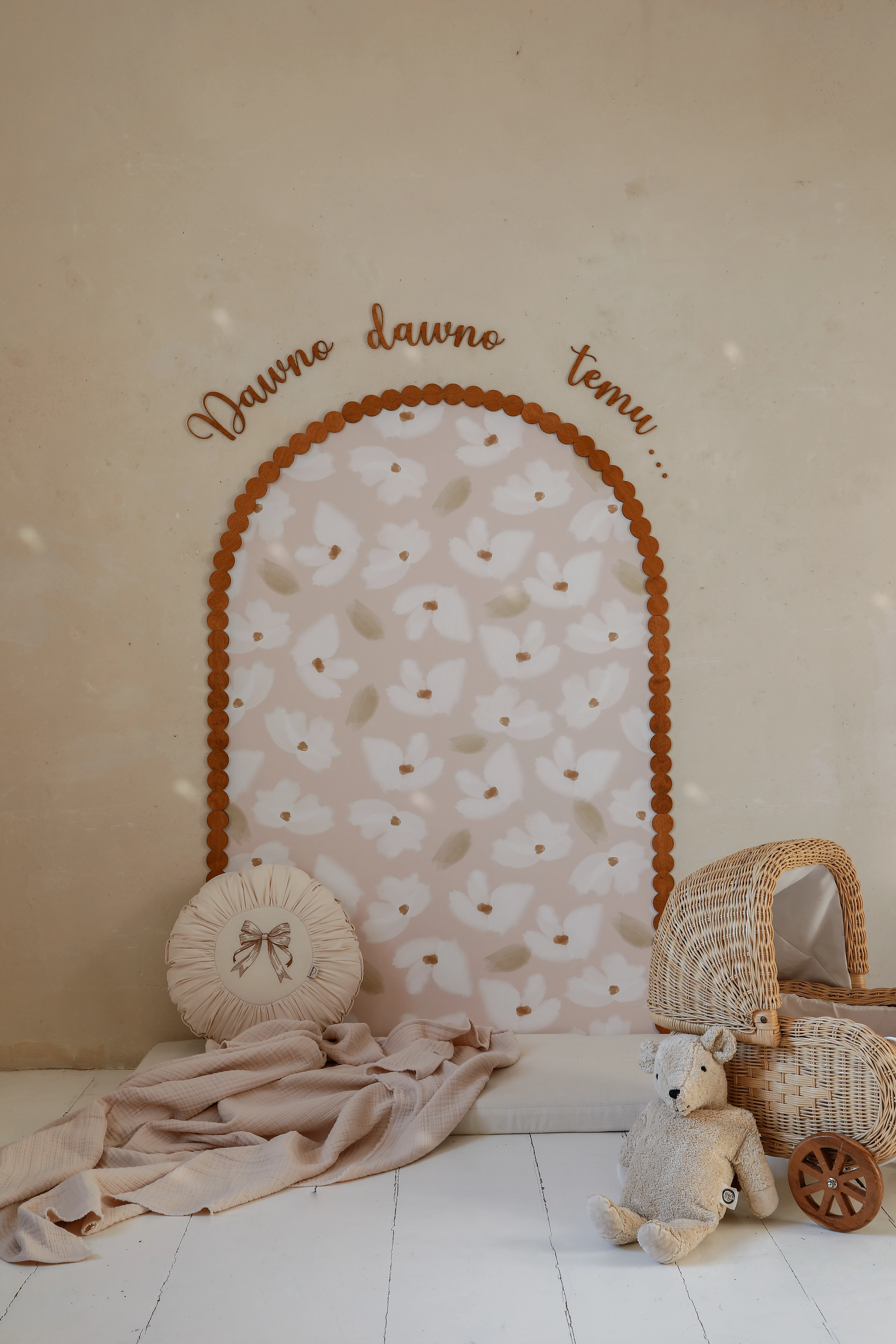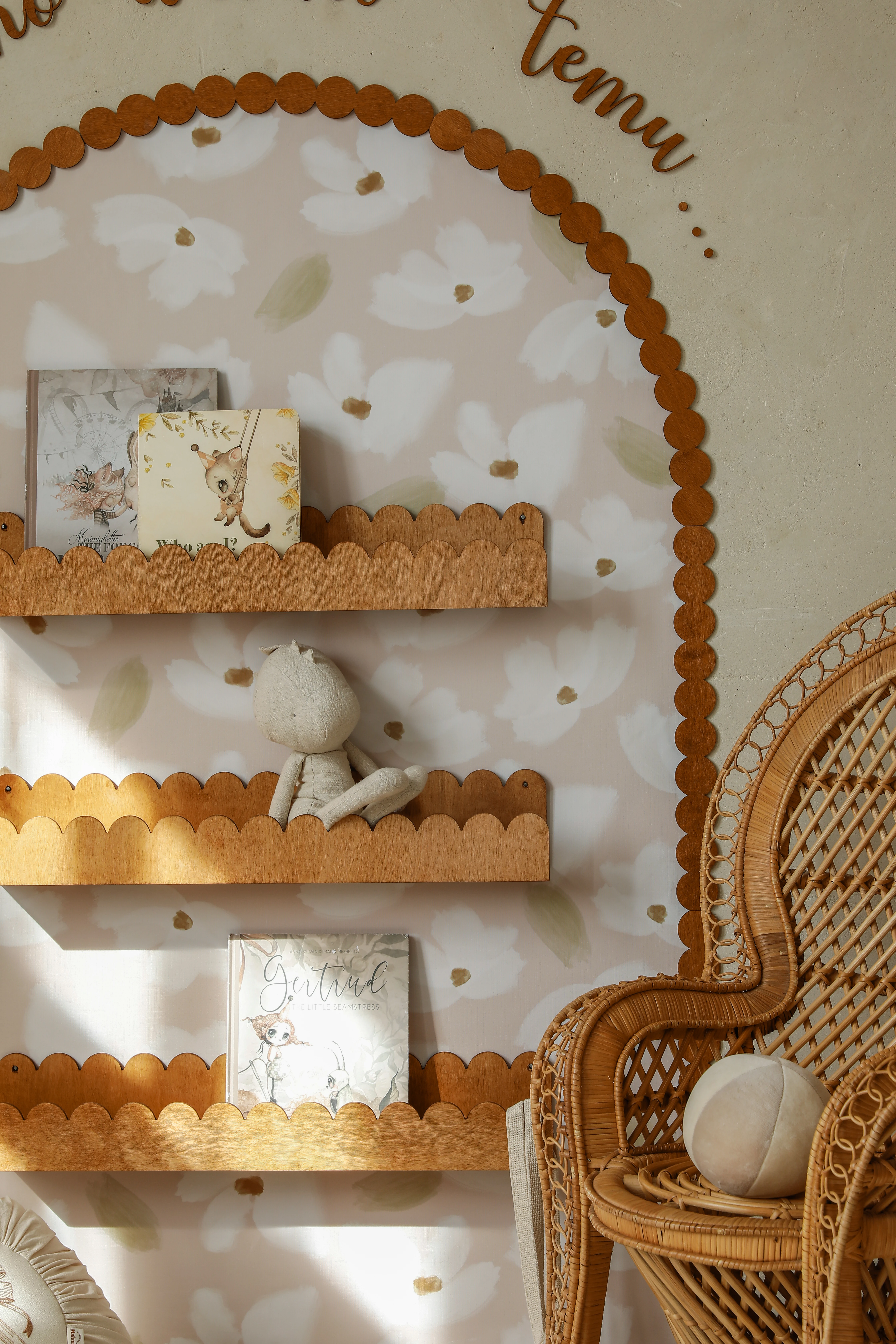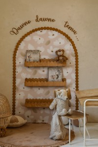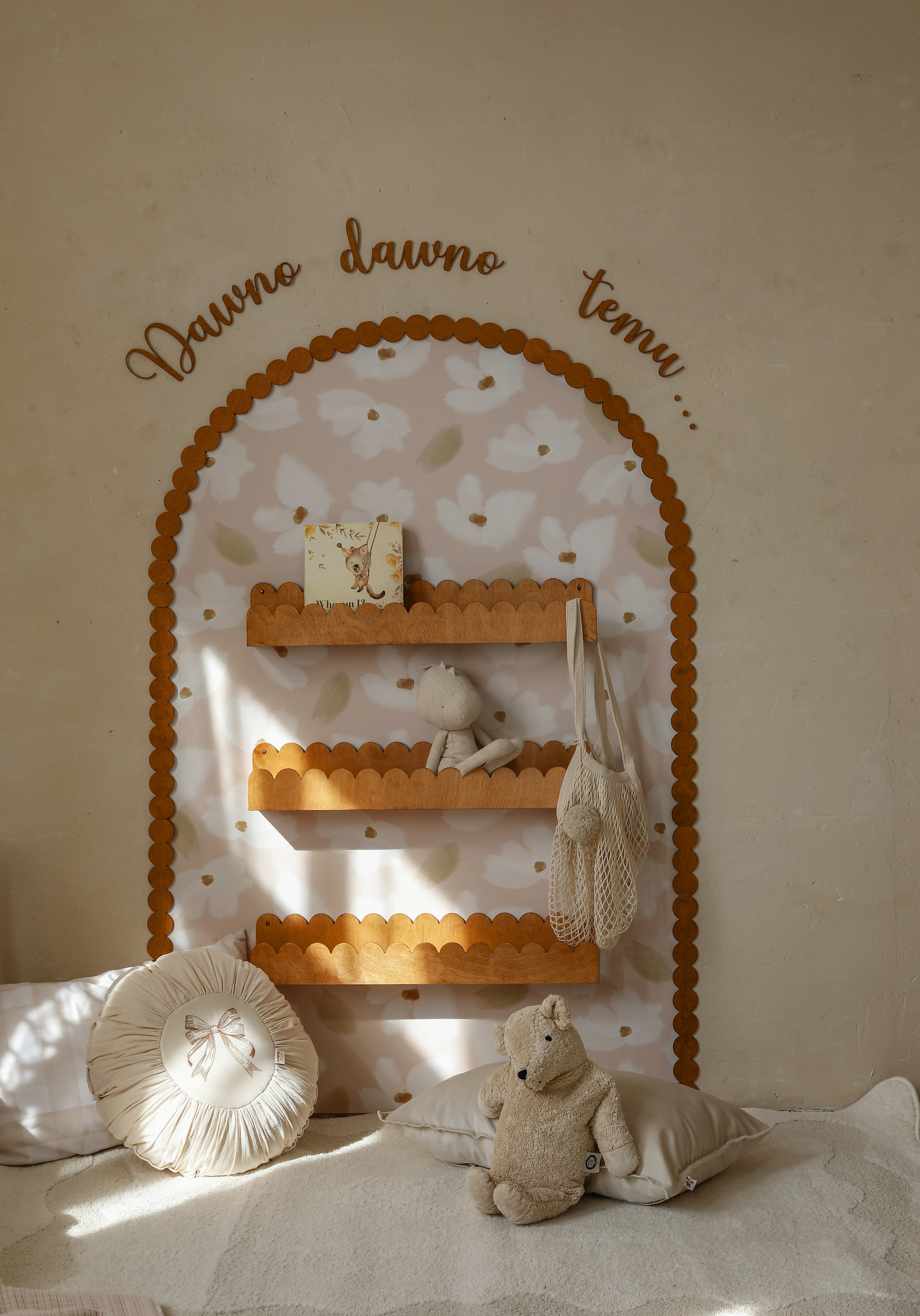 To zestaw dekoracyjno-użytkowy do pokoju dziecka w klimacie retro, bobo i natural. Łuk „zbiera” całość wizualnie, półki dodają funkcji, a napis domyka kompozycję – dzięki temu nie trzeba zastanawiać się, co jeszcze powiesić obok.
