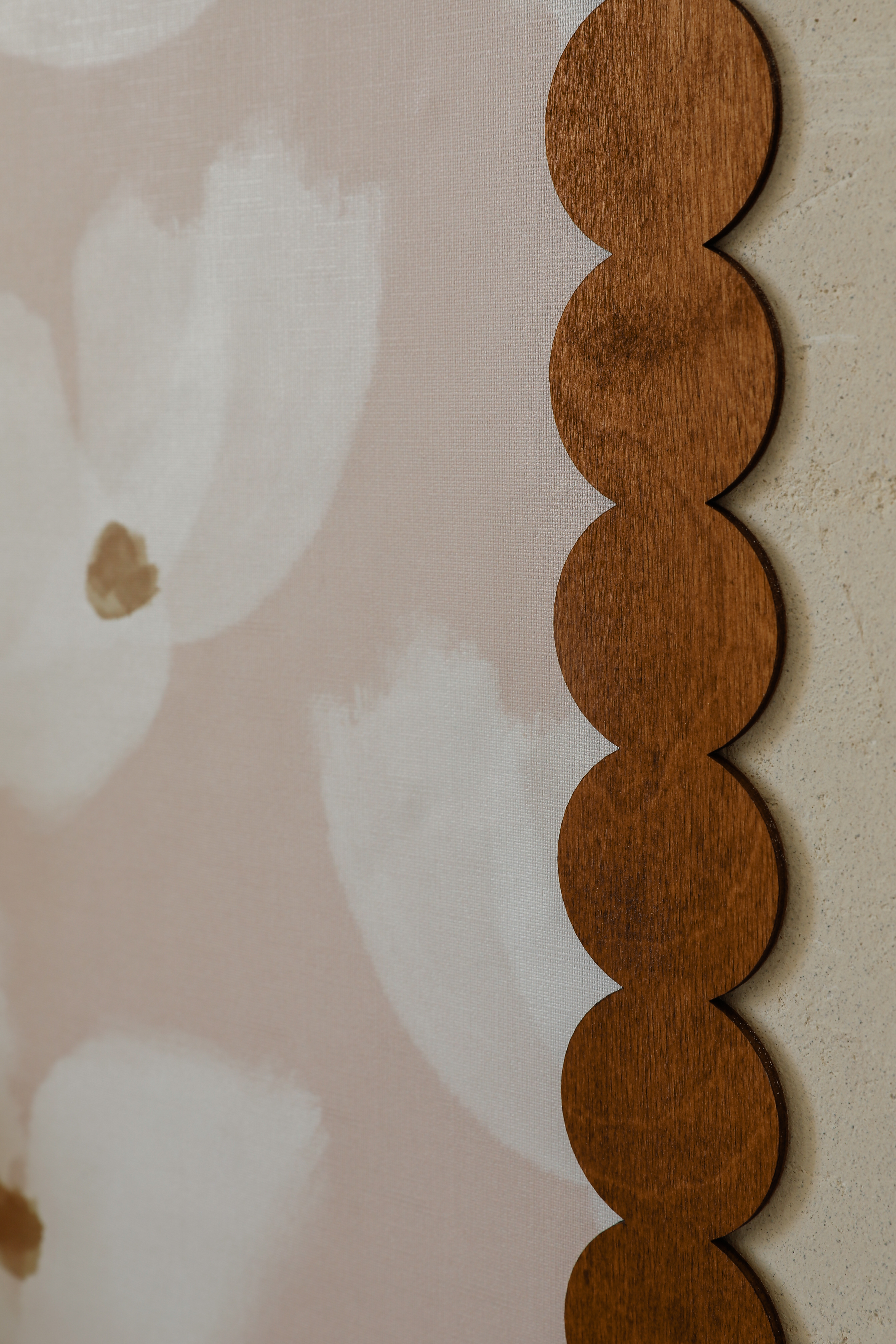 Ciepły odcień drewna i delikatne kwiaty tworzą tło, które nie dominuje – tylko porządkuje przestrzeń.