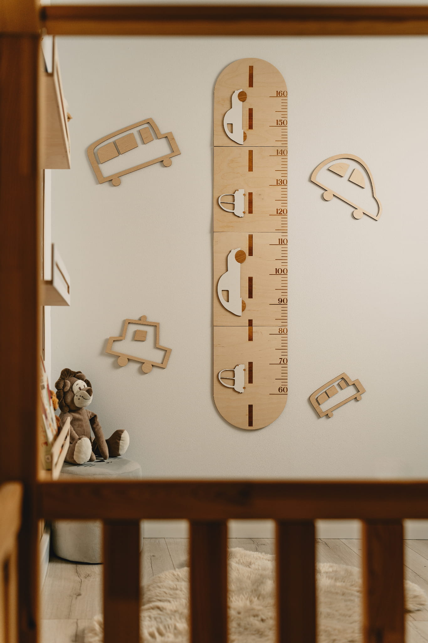 Drewniana miarka wzrostu „Autka” – stylowa dekoracja i praktyczny dodatek do pokoju dziecka