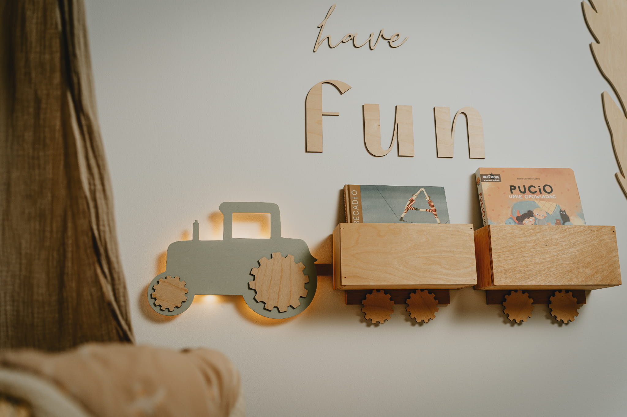Stylowa półka-lampka „Traktor z przyczepami” – funkcjonalność i design w pokoju dziecka